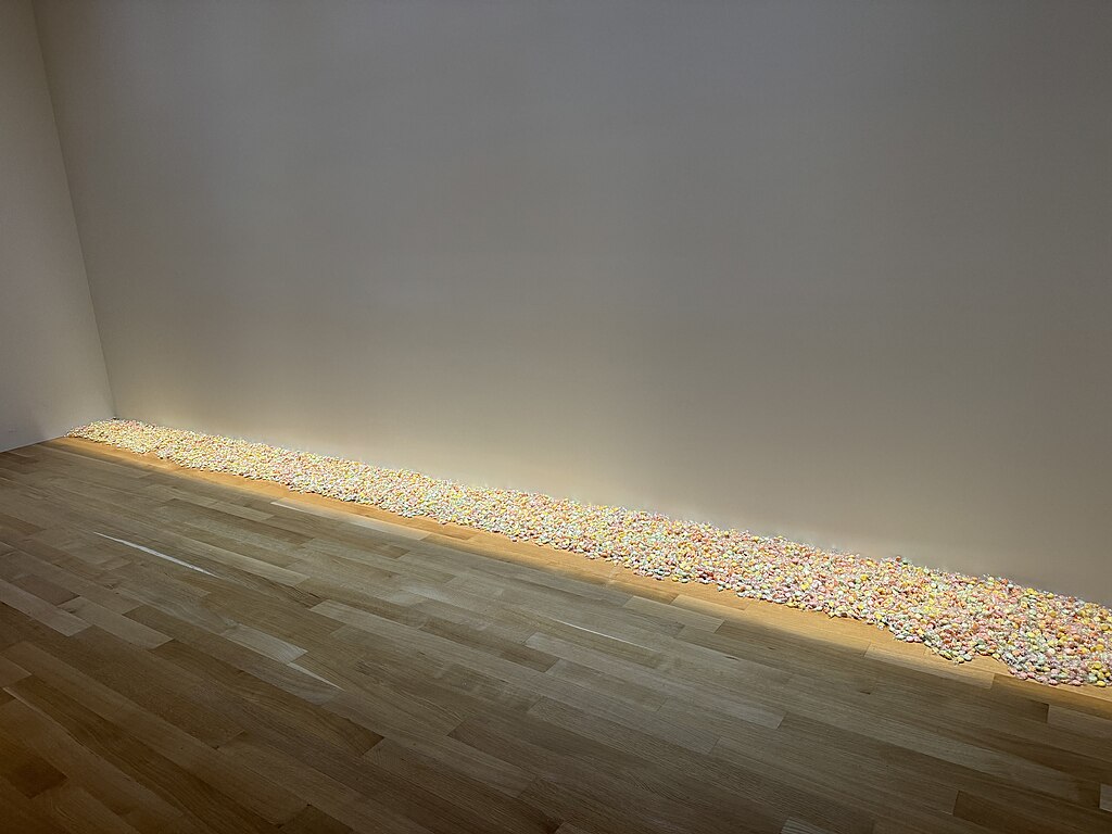 Félix González-Torres’ "Untitled (Portrait of Ross in L.A.)" is an interactive installation consisting of a pile of candy, representing the body weight of the artist’s partner before his death from AIDS. Viewers are invited to take a piece of candy, symbolizing the gradual loss experienced during the AIDS crisis. This poignant work explores themes of love, loss, and impermanence, creating a deeply personal yet universal narrative. By engaging the audience directly, González-Torres redefined the boundaries of art, making it a shared and transformative experience.