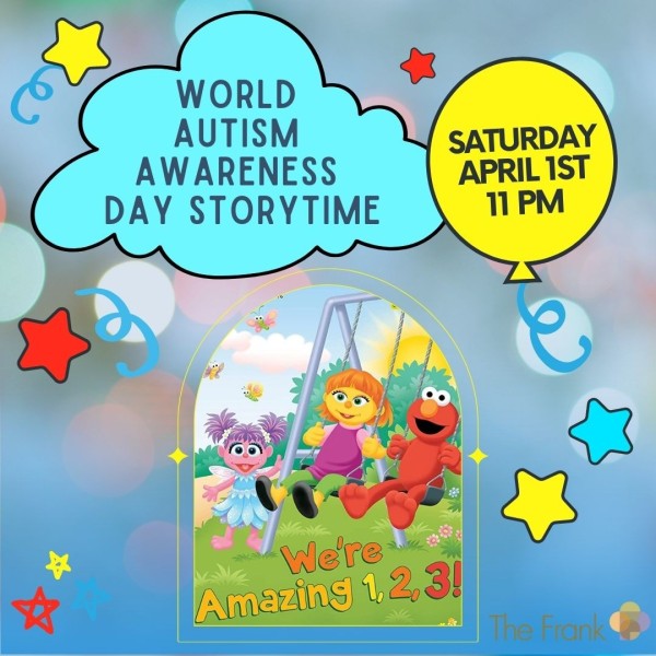 The Frank welcomes children and their caretakers for Storytime Hour! This month celebrate Autism Awareness with a story about friendship, “We Are Amazing, 1, 2, 3” written by Leslie Kimmelman. The story features some of our favorite friends from Sesame Street as they learn that our differences can bring us together. After reading, children will get creative with a guided art activity led by the artist Apia.